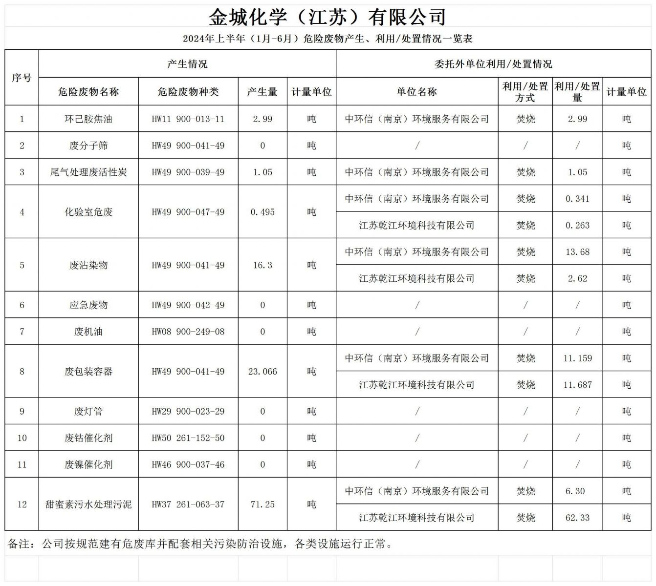 金城化學(xué)(江蘇)有限公司2024年上半年(1月-6月)危險危物產(chǎn)生、利用/處置情況一覽表